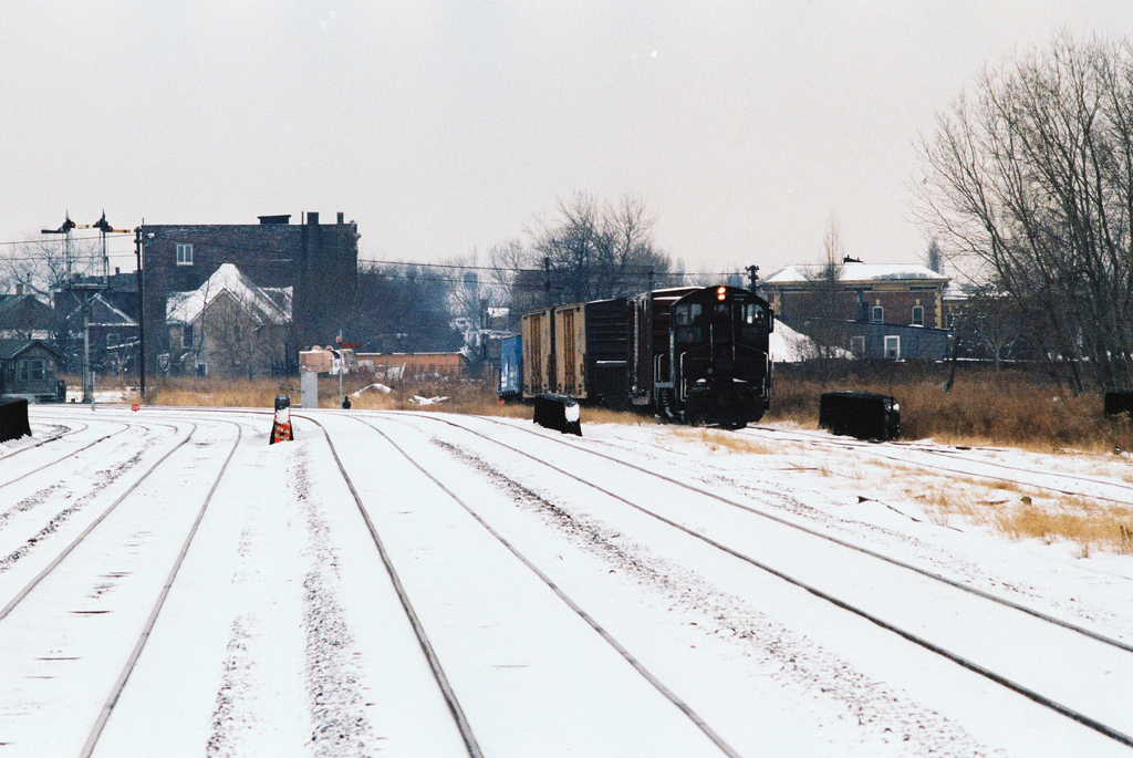In December 1981, a Conrail local freight heads west on the former PRR Panhandle at Brighton Park. Note the semaphore blades and signalman's shack to the left of the train. Until 2005 or 06, this was the largest manually controlled interlocking in the entire country. Doug Davidson photo with permission