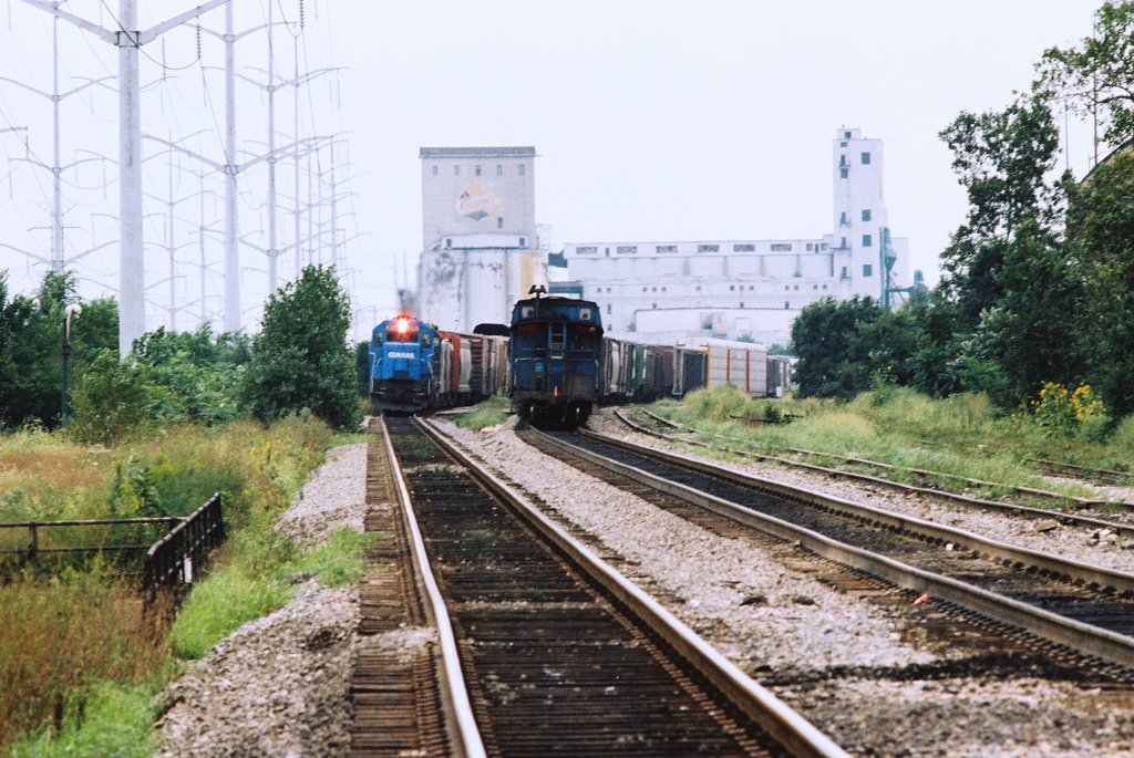 The head end of a Conrail westbound meets the cabin car of an eastbound at South Chicago, in September 1981. The Falstaff Elevator looms large behind. Doug Davidson photo with permission
