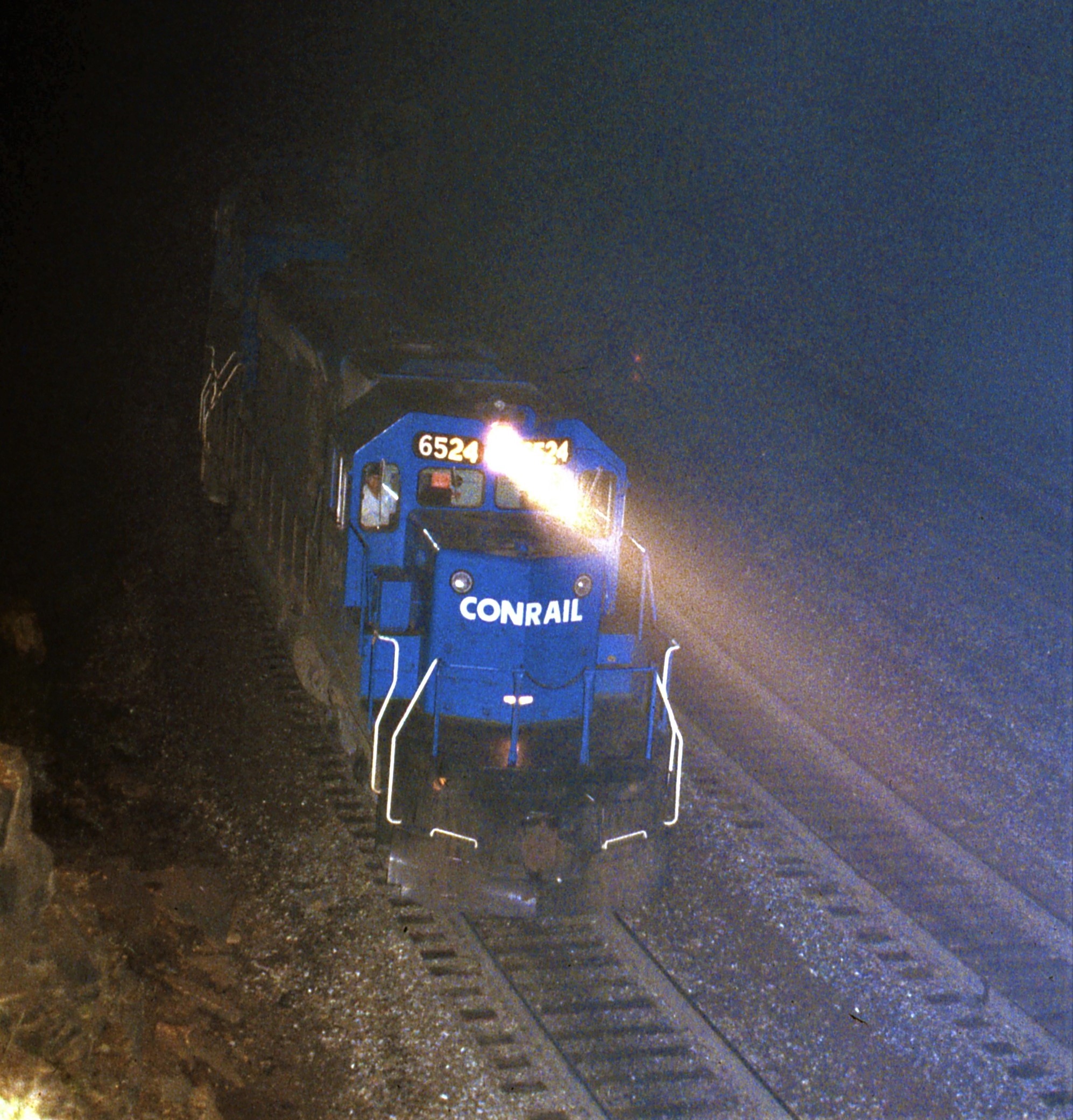 SD40-2 #6524 at Bennington Curve on a foggy night in September 1981.  Climbing towards Bennington interlocking, the tunnels and to Cressons.