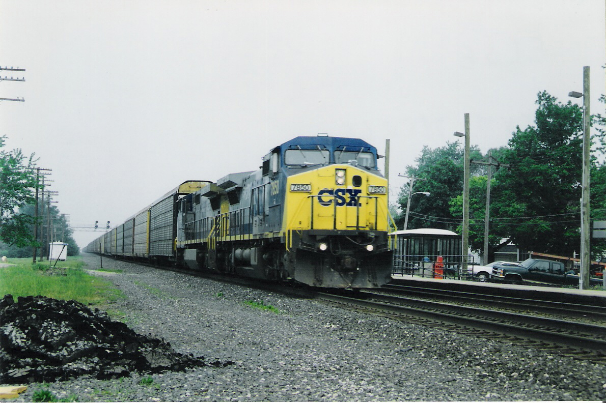 CSXT 7850 and fellow GE lead an eastbound autorack train at Waterloo, IN on May 23, 1999