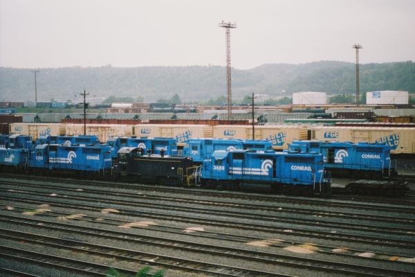 Action in the Paint Shop at Conrail's Juniata Shops on October 3, 1994. At the time of Doug's visit, Conrail was performing contract work for CSX, explining why these CSX units were being prepared for repainting. Doug Davidson photo with permission