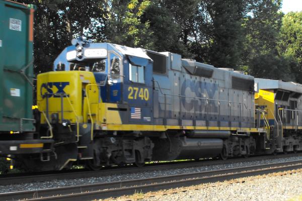 CSXT C40-8W 7656 and ES44AC 3204 roar by CSXT GP38-2's 2759 (CR 8162) and 2626 with a line of autoracks at mile 835 in Tyrone, GA on December 5, 2014.