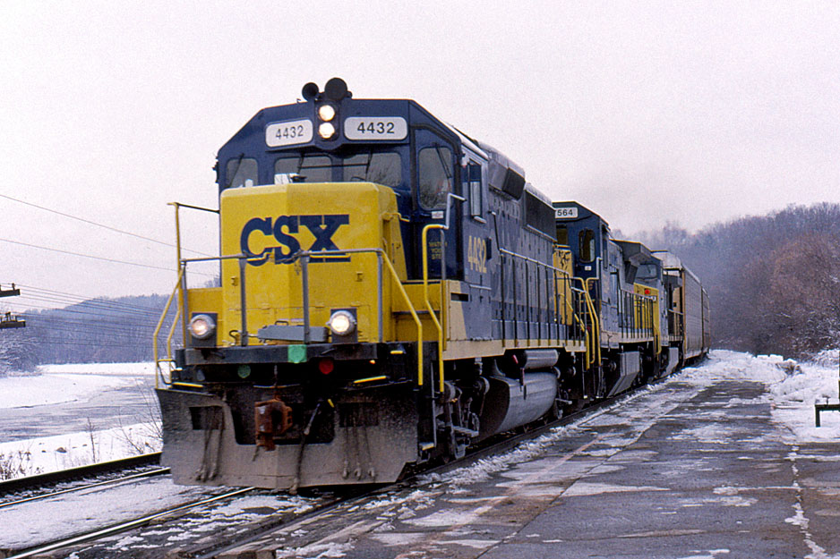 CSX 4432 (ex-CR 3357) is on the point of an eastbound autorack train at Amsterdam, NY 12/2002