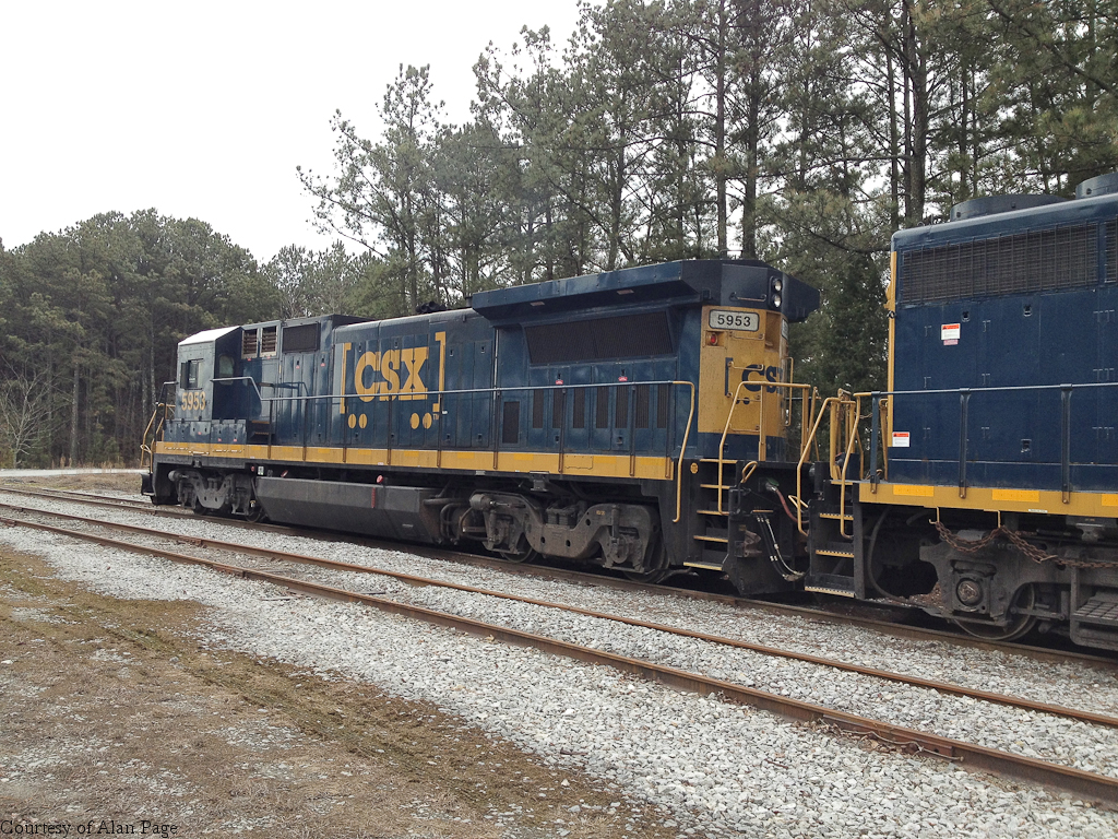 CSXT B40-8 5953 (CR 5065) rests between assignments along with GP40-2 6145 (ex-B&O 4246) at E.R. Snell in Fairburn, GA on March 6, 2015.
