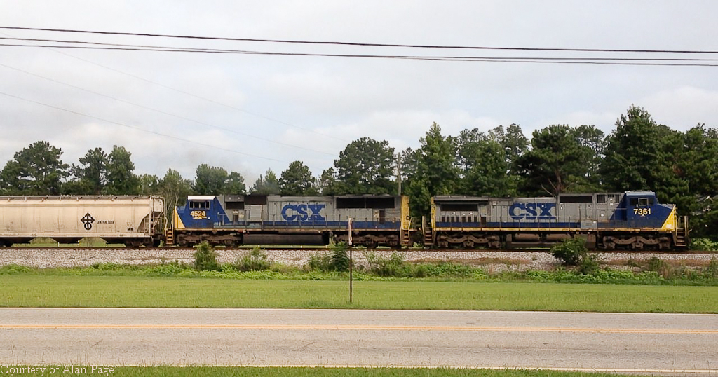 CSXT C40-8W 7361 (CR 6201) and SD70AC 4524 pound a load of mixed freight northbound near mile 834 in Tyrone, GA on August 2, 2014.