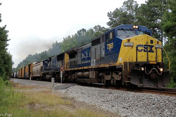 CSXT C40-8W 7363 (CR 6204) and ES40DC 5435 lead a line of autoracks through Union City, GA on March 21, 2015.