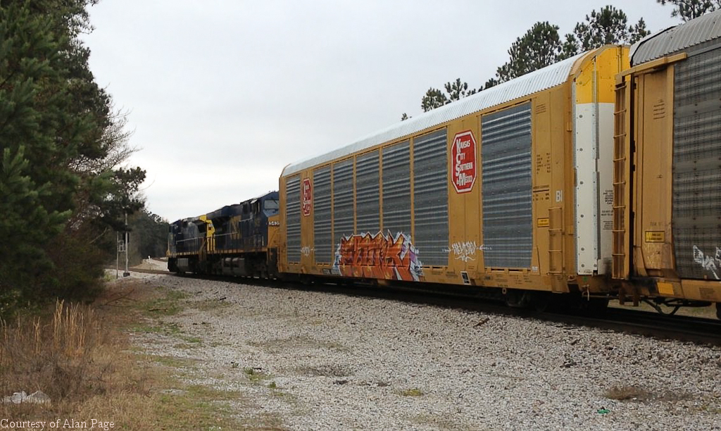 CSXT C40-8W 7363 (CR 6204) and ES40DC 5435 lead a line of autoracks through Union City, GA on March 21, 2015.