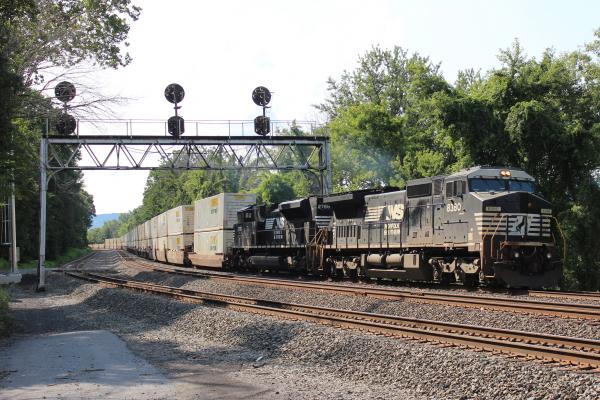Running 3rd behind CSXT ES40DC 5413 and C40-8W 7711, former CR C40-8W 6263 passes through the Gullatt Road crossing in Fairburn, GA on November 1, 2016.