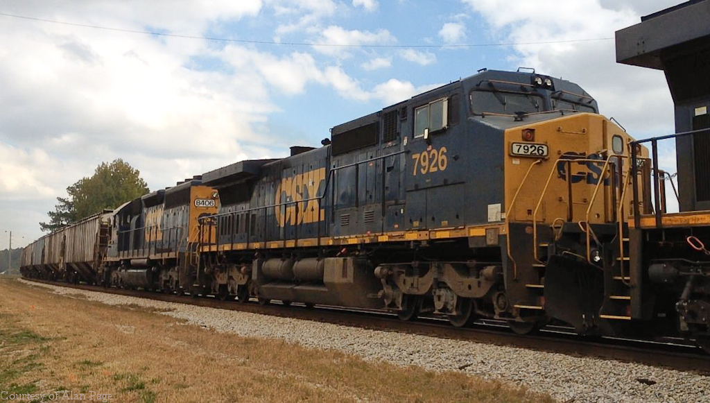 CSXT ES44AC-H 796, C40-8W 7926 (LMS 708), and SD40-2 8406 hustle through Palmetto, GA on October 15, 2016.