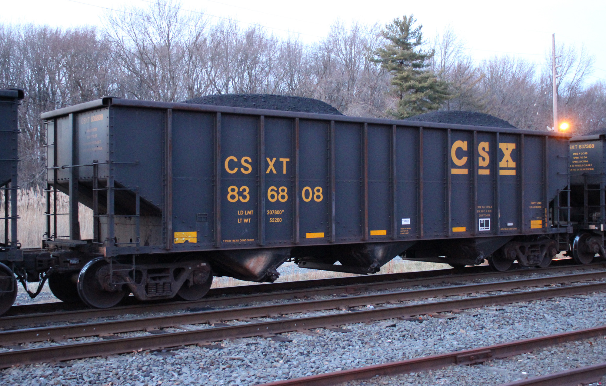CSXT 836808 is seen at Deepwater, NJ on 12/8/19. Car is ex NYC 498628 which was built as a CR H2C class hopper in 6-98. Then was re-bodied and renumbered to CSXT 836808 in 9-14 by FCA at Roanoke, VA.