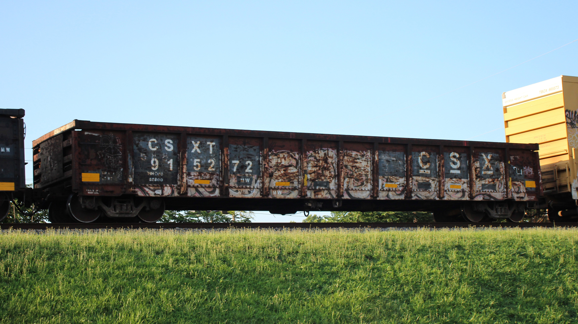 CSXT 915272 is seen in the consist of CSX Q438-13 at Newark, DE on 7/14/19. Car is ex NYC 588398/CR 588398/CR 576138/PC 576138 and was built 2-68 as a PC G43A class gon. Photo by Chris Carangi.