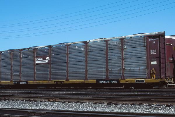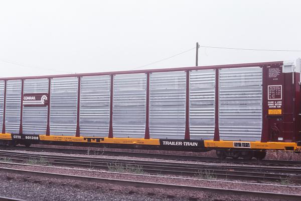 CTTX 900979 is seen at Norwood, OH on 5/6/85. Photographer Joseph R. Quinn, Collection of Jeff Weaver Photo Date 05/06/85 See More Photos Conrail Freight Cars Autoracks CTTX Tri-Levels