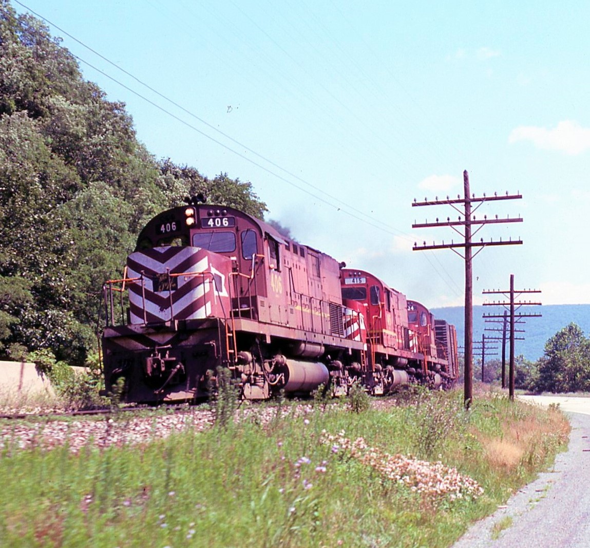 Ex-Lehigh Valley Alco's #406, #415 & #404 on P&E along side Rt 322 near Rockville, PA. July 17, 1976