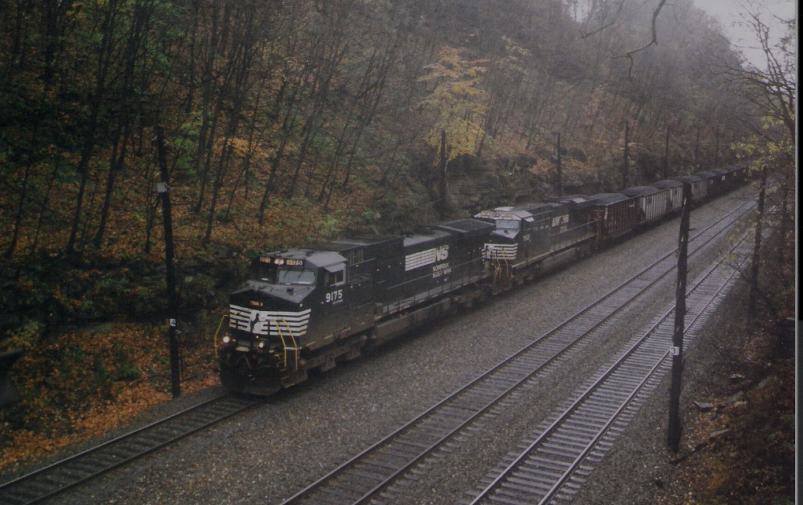 Eastbound coal train with NS 9175 and 7521 for power struggles upgrade at Cassandra, PA on Oct. 25, 2008