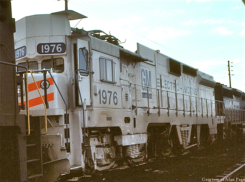EMDX 1976 rests between CR SD-40 6282 and E-44 4412 in short term storage at Harrisburg yard in May, 1977.