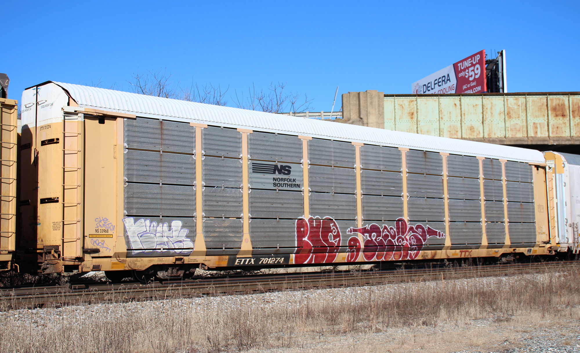ETTX 701274 is seen in the consist of CSX M216-02 at Twin Oaks, PA on 2/4/24. Rack was built as CR 7365, a CR ML3N class rack, in 4-89. It was then rebuilt, repainted, and renumbered to NS 33968 in 4-12 by TRA-L. Rack is now classed FT640 by NS.