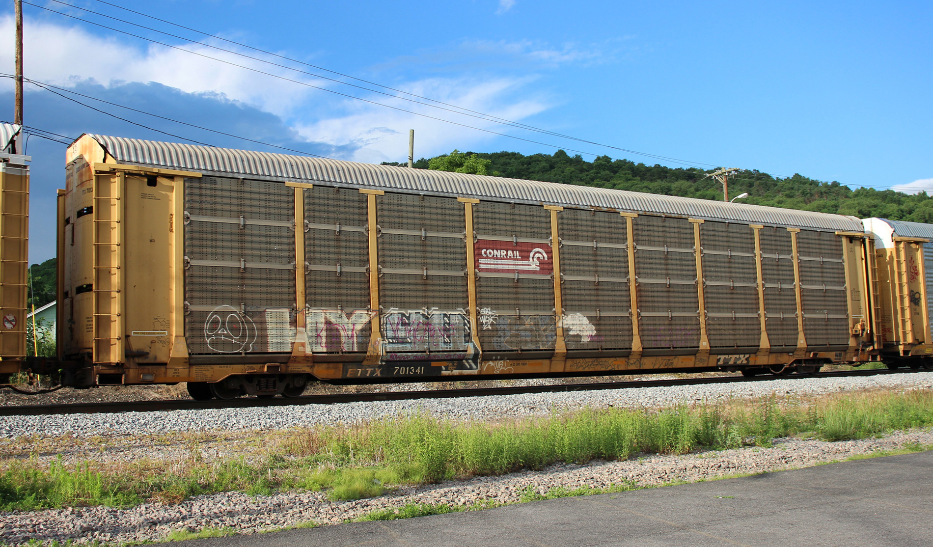 ETTX 701341 is seen in the consist of CSX Q217-19 at Cumberland, MD on 6/19/19. Rack number is CR 7274, built 4-89, rebuilt 7-98, and is now owned by NS.