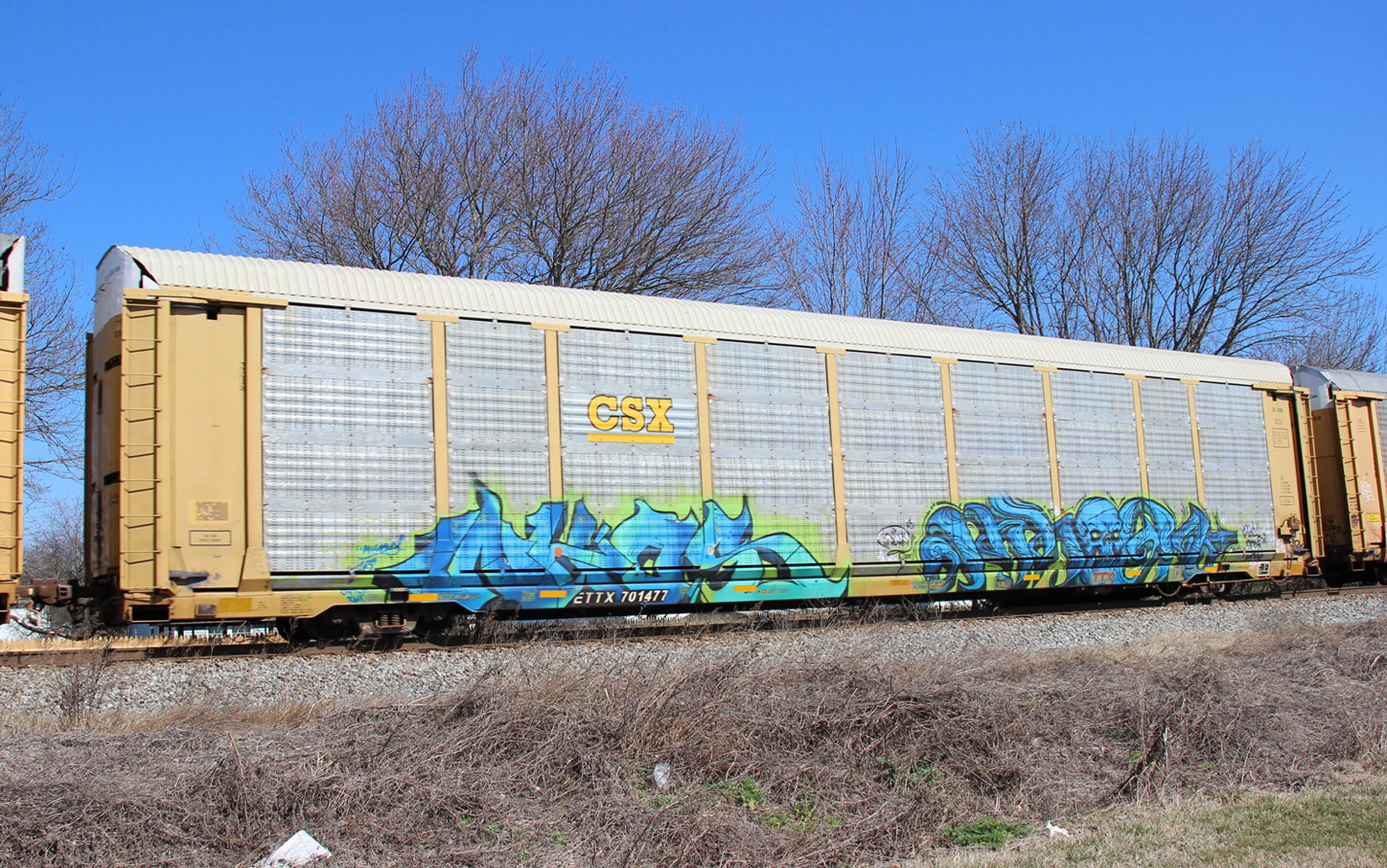 ETTX 701477 is seen in the consist of CSX Q216-06 at Newark, DE on 3/8/20. Rack number is CR 7406, built 5-89 and was rebuilt and repainted CSX in 5-12.