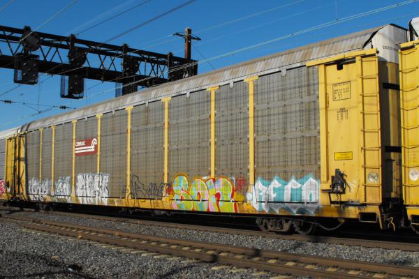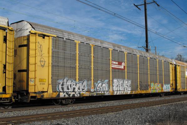 ETTX 908664 is seen on 33A at Wormleysburg PA on 7/9/11. Rack number is CR 8570 built 12-89 and rebuilt and repainted yellow 9-98.