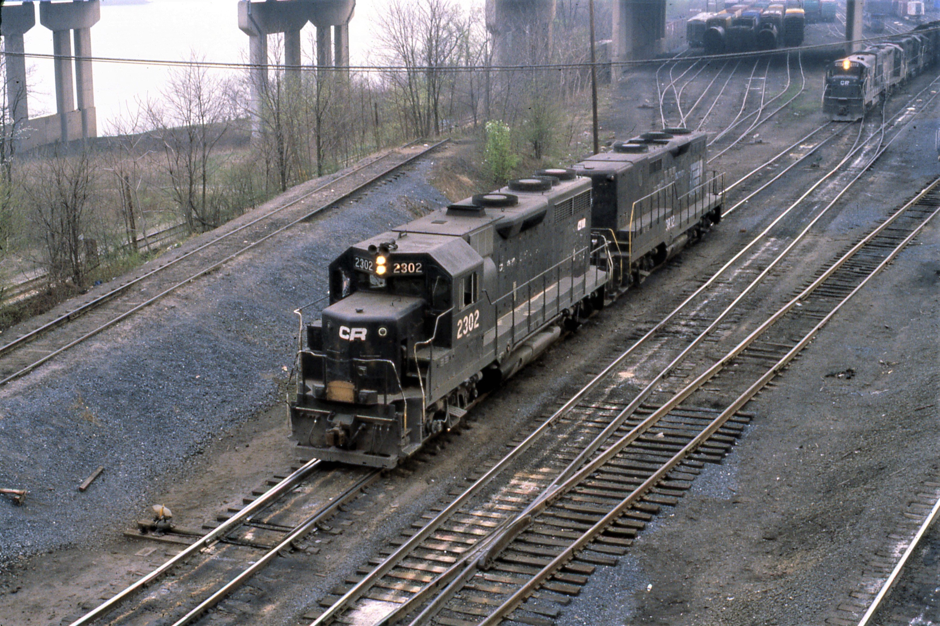 Conrail. Ex Penn Central GP-40 #2302 & GP-9B at west end of Enola yards. Enola, PA. April 10, 1979 taken from the Iron Bridge.