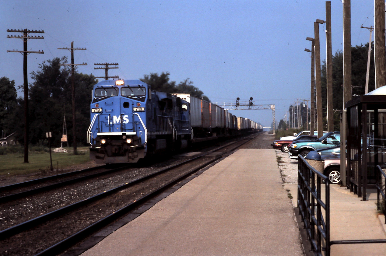 LMS 719 and friend leads Mail-8 at Waterloo, IN on August 15, 1998