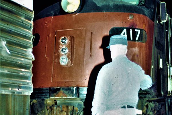 CR. Amtrak E-8 #417 coupling to Broadway Limited, Harrisburg, PA. 9/17/78
