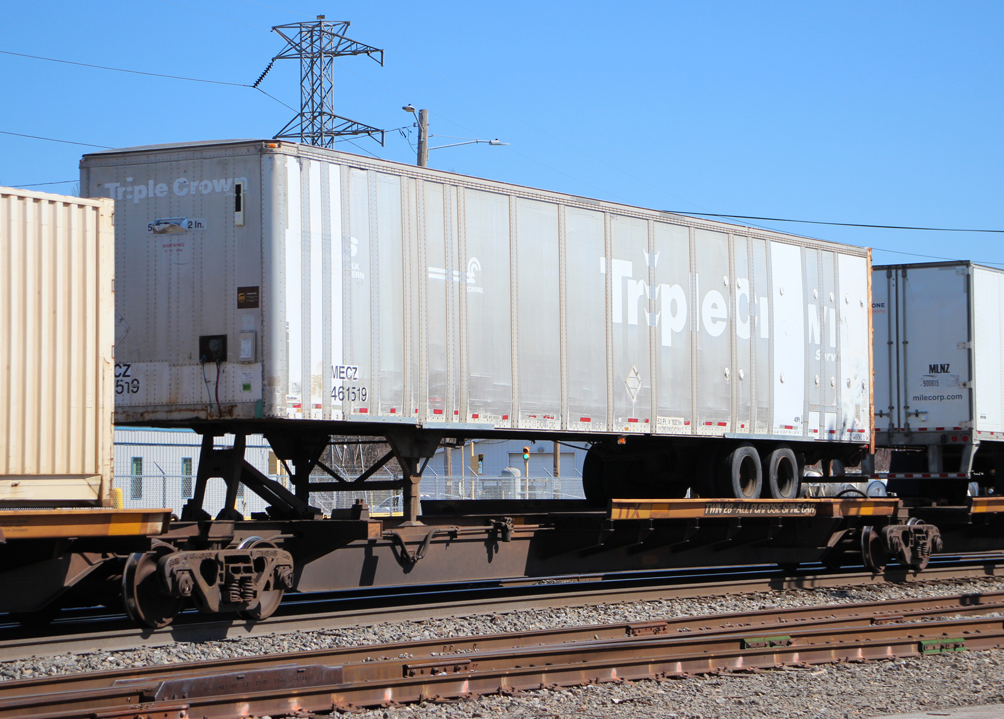 MECZ 461519 is seen in the consist of CSX I032-23 at Elsmere, DE on 3/24/24. Trailer is ex TCSZ 461519.