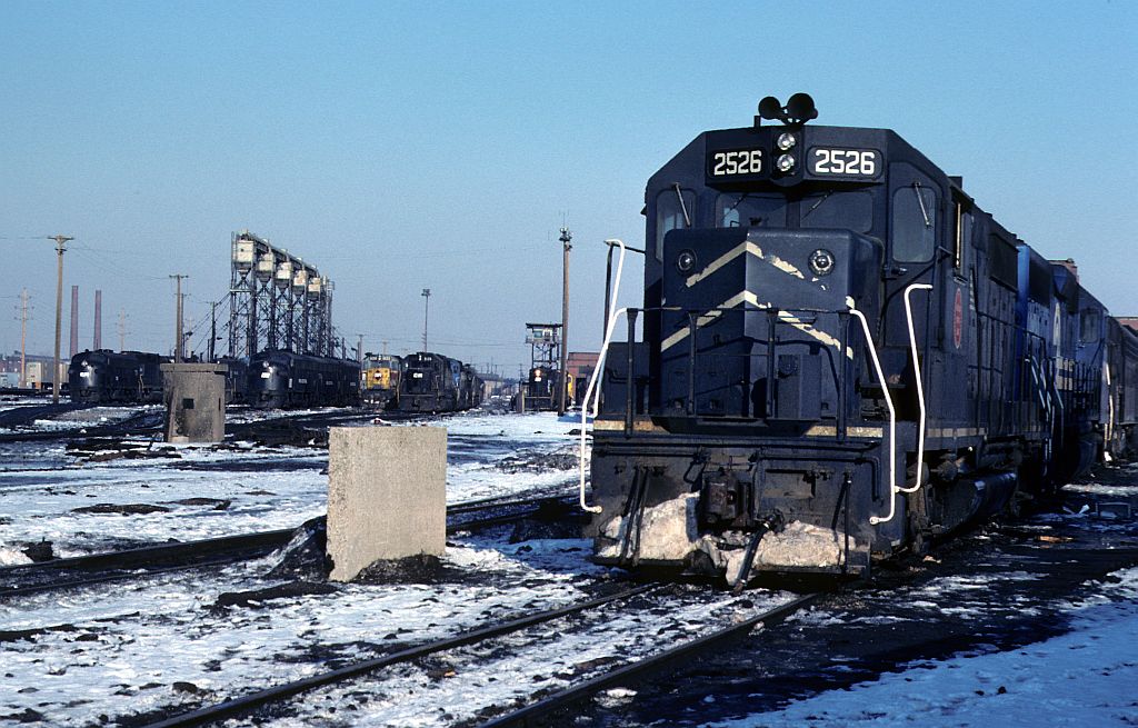 Conrail was very power short during the first few years of operation and leased a wide variety of other railroads power to keep the RR fluid. One example is this Missouri Pacific GP35, number 2526, waiting for some shop attention at the P1A while ex PC Fs and EL geeps occupy the service area at Collinwood shops in Cleveland,Ohio in Feb 1977.