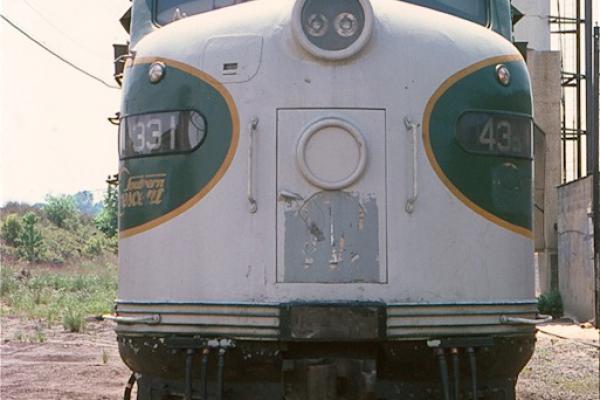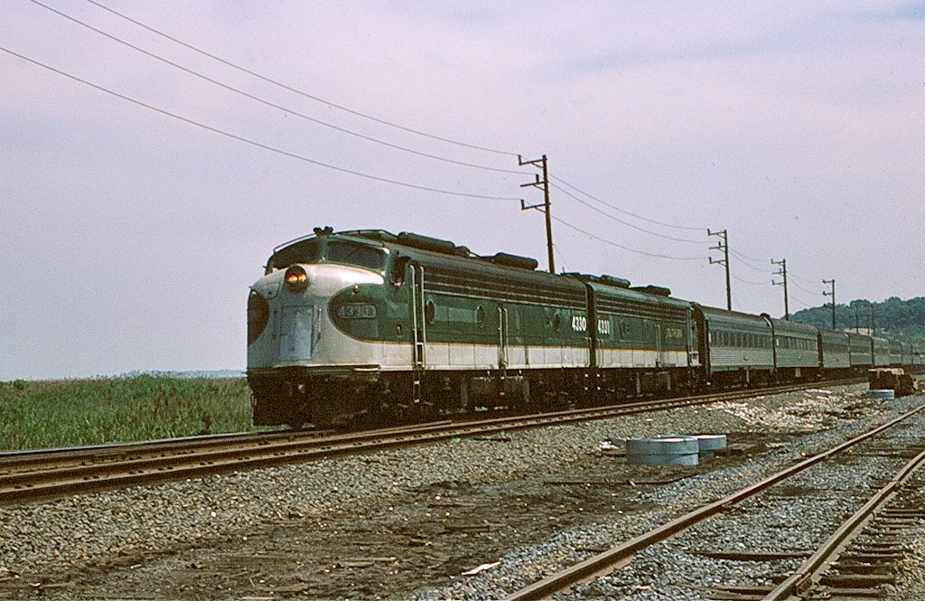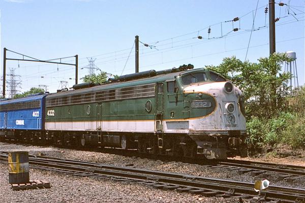 NJDOT E-8A's 4330 (ex-SR 6914) and 4331 (ex-SR 6907) pull nine cars near South Amboy in June, 1980.