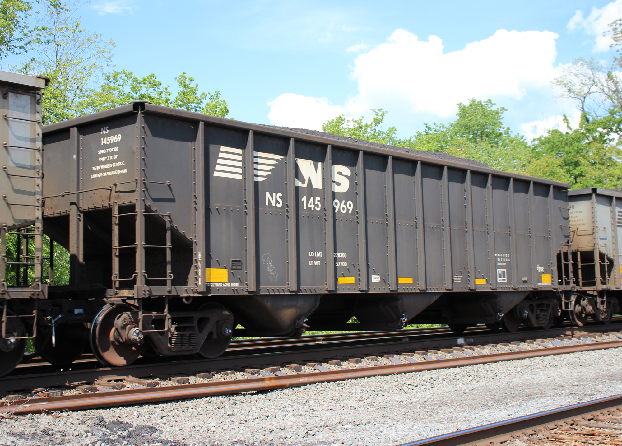 NS 145969 is seen in the consist of NS 590 at Cove, PA on 5/15/21. Car is ex CR 498138, which was built as a CR H2B class hopper, in 5-95. It was then re-bodied and renumbered to NS 145969 in 11-13 by FCA at Roanoke, VA.