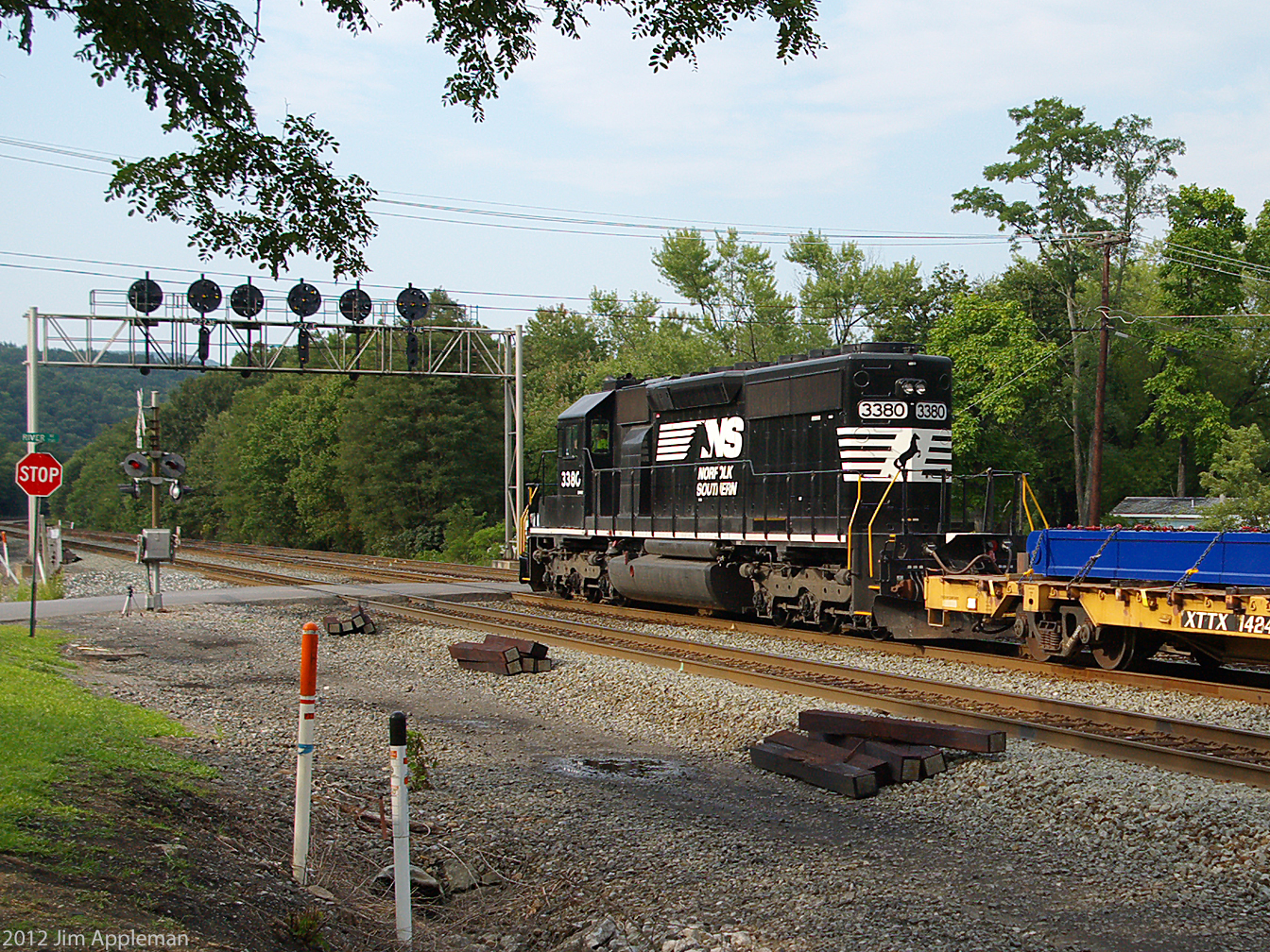 NS 3380 leads NS 090 High-and-Wide east with the world's two largest rail cars, Schnabel cars Krupp WECX 800 and new out of New Castle, PA Kasgro Rail Car Solutions WECX 801.