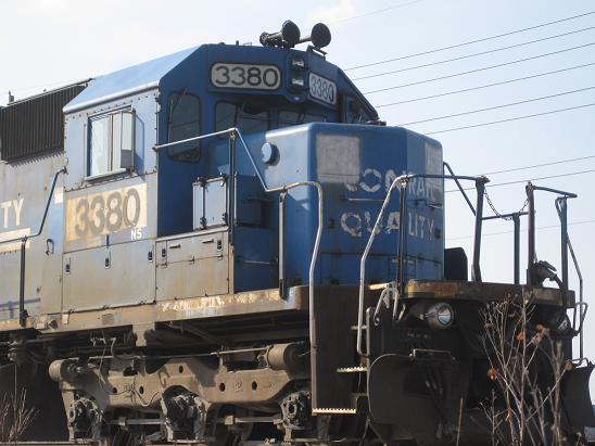 NS sd40-2 3380, with patched markers and a respray patch, sits on a siding near Cleveland waiting for a crew.