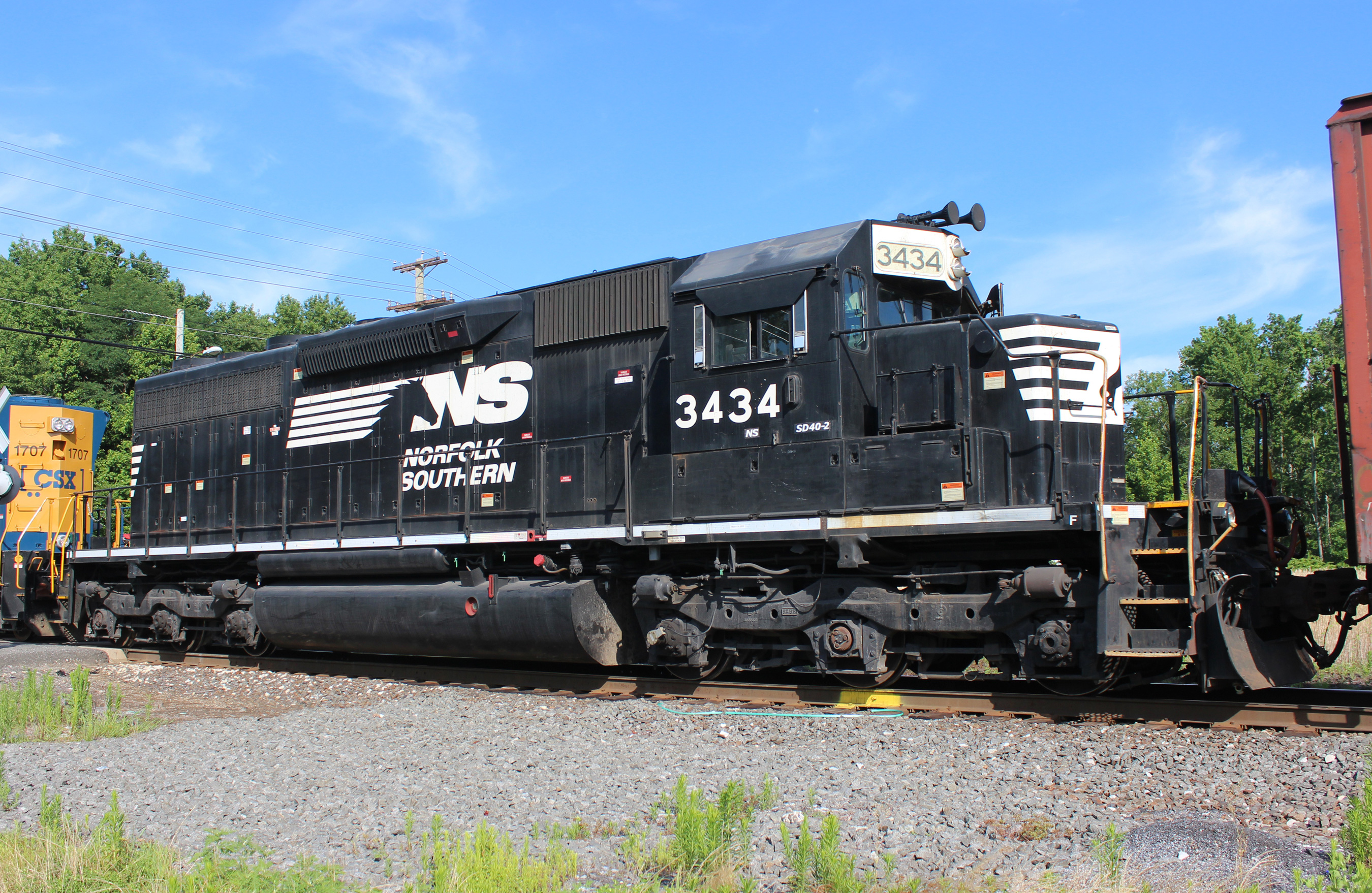 NS 3434 is seen on CSAO CA-11 at Bridgeport, NJ on 7/3/17. Unit is ex CR 6977/CR SD40 6330/PC 6077/PRR 6077 and is 1 of only 6 active SD40-2R's on NS' roster.