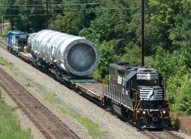 Former CR 8086 is seen on an Air Products heat exchanger move (CSX W982) heading to Morrisville for export at Upper Makefield, PA on 7/19/2009. NS 5299, another ex-CR GP38-2, is at the other end.