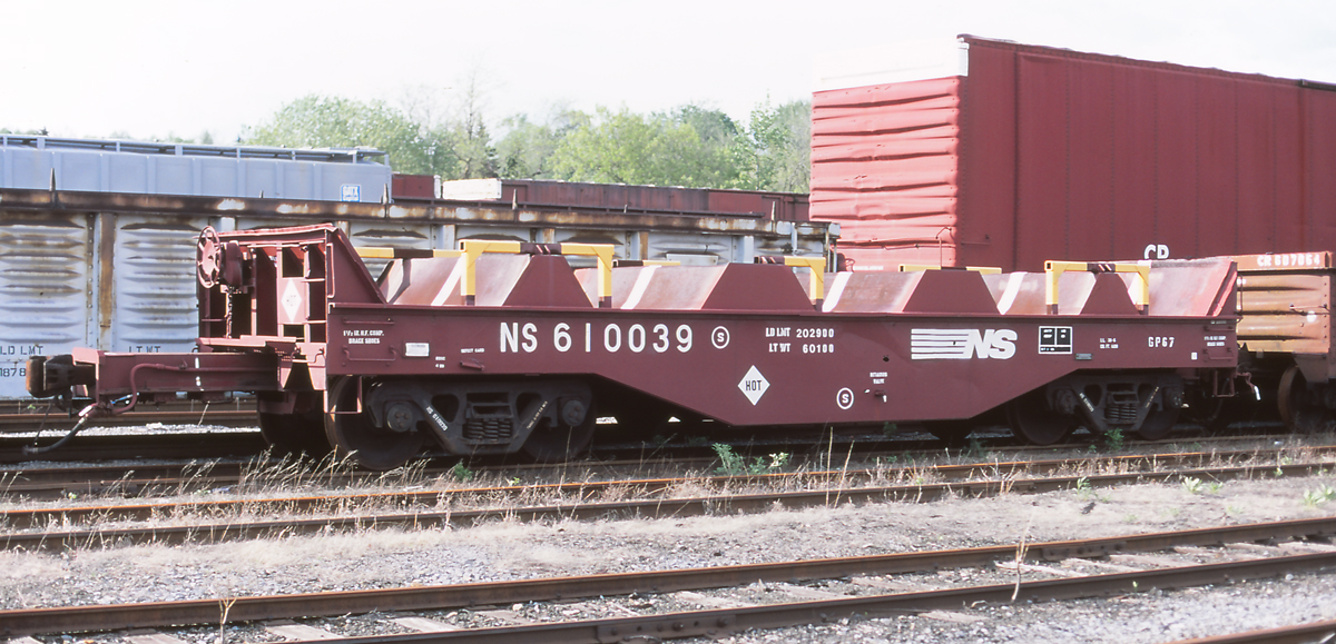 Car is ex CR 606602/CR 622526/PRR and was built 2-66, repainted NS 10-00. Check out the draft gear on this end of the car.