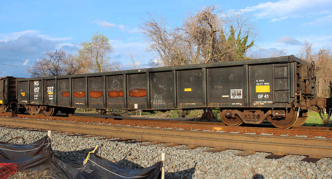 NS 617327 is seen at Westville, NJ on 4/20/15. Car is ex CR 576680/PC 576680, built 3-68 and was rebuilt 3-90. Car was repainted NS 1-07 by RA DFWB and is classed GP41 by NS.