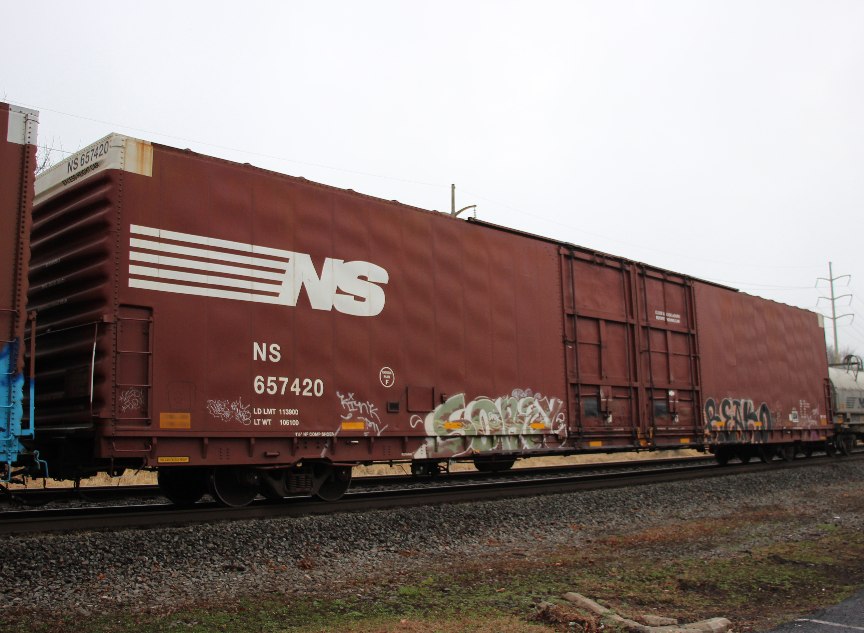 NS 657420 is seen in the consist of NS 14G at Wyomissing, PA on 4/6/19. Car is ex CR 240735/CR 295549/PC 295549 and was built 10-69 by P-S.