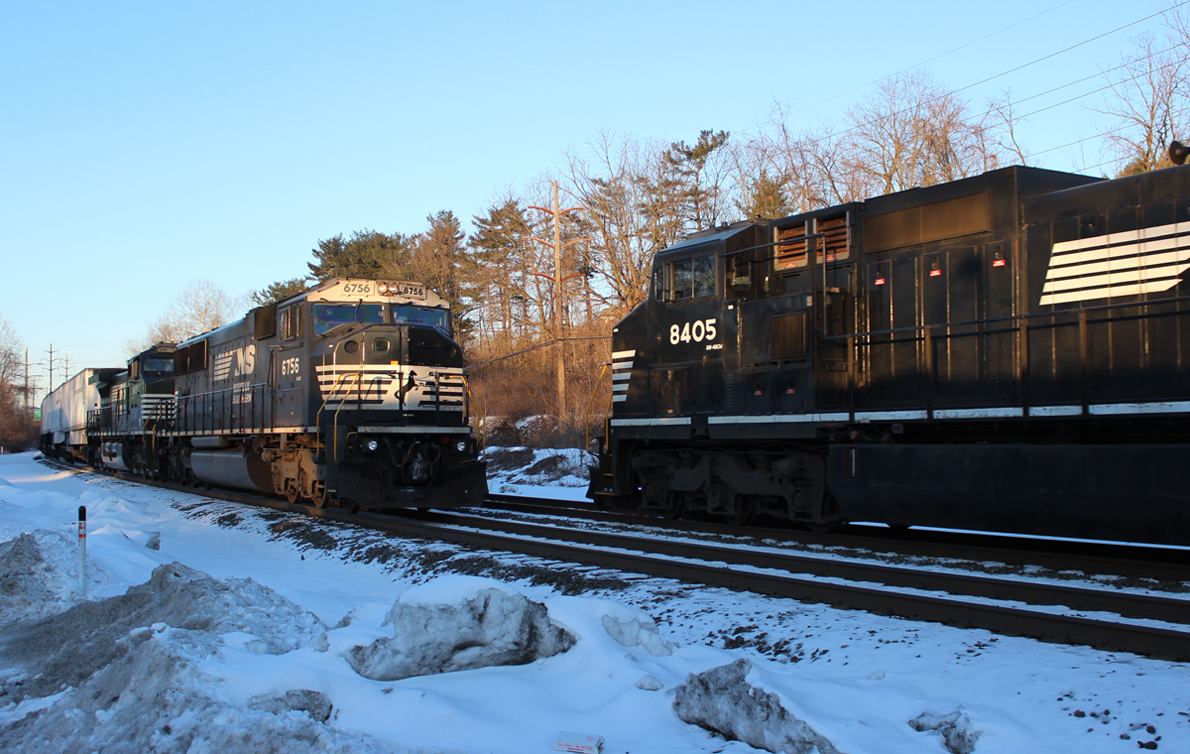 A pair of former CR units meet as NS 8405 (CR 6207) leads NS 23Z west past a stopped NS 24K with NS 6756 (CR 5643) in the lead at Wyomissing, PA on 2/2/4/15.