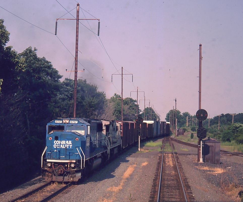 NS SD60I 6757 (Ex CR 5644) leads C32-8 8467 (Ex CR 6617) out of Morrisville, PA passing thru CP MA in a view taken as I waited for him to clear the thorofare. There's a lot missing from this scene now since this shot was taken. Not only has the 8467 been retired but the Metuchen block that was a remnant of the old PIML/LMPI trains have also been lost when the Metuchen GM plant closed and other Metuchen bound freight was rerouted. Also gone from the scene are the classic PRR position light signals, replaced by the sterile color light signals a few years later. At least the 6757 remains in blue.. for now...