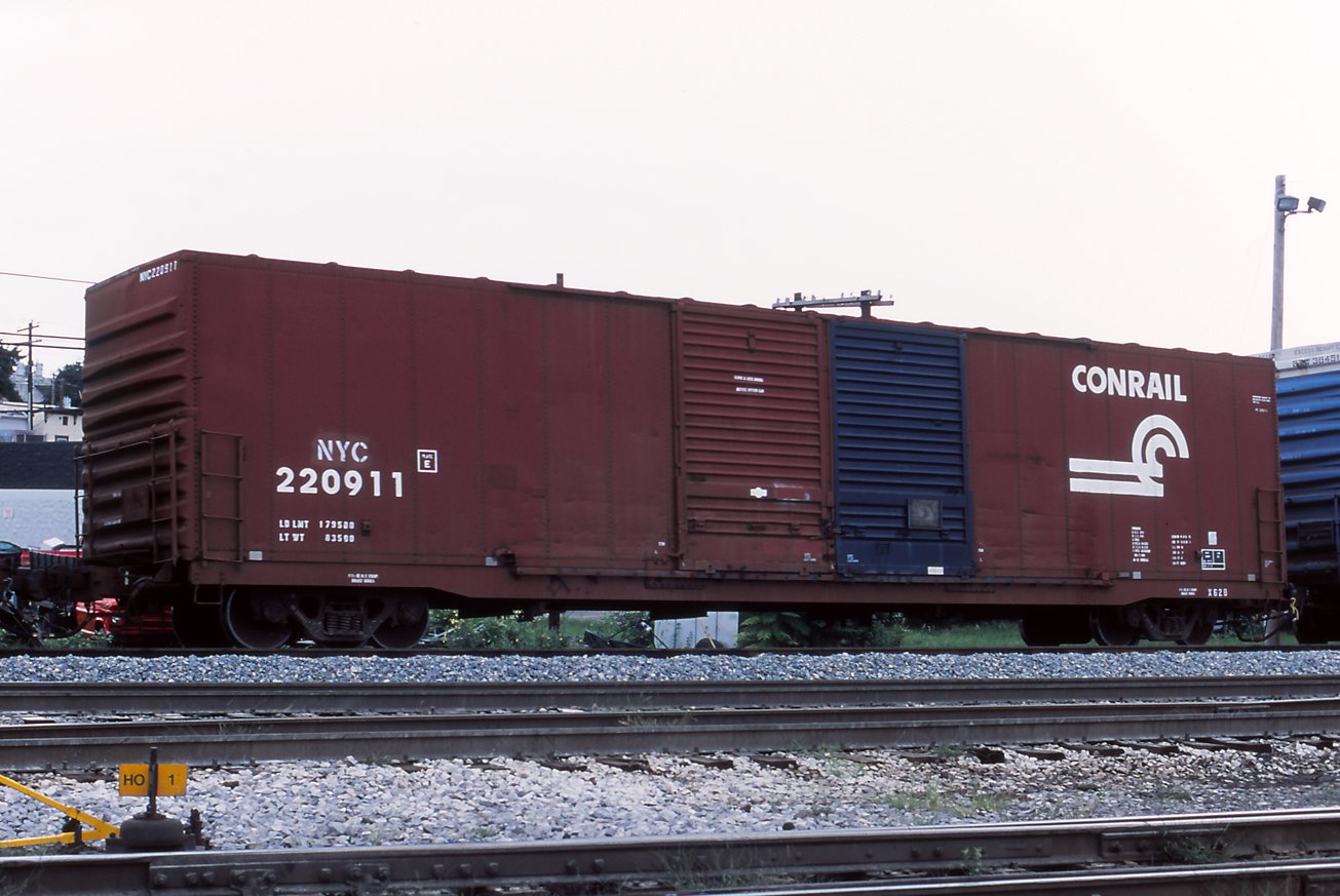 NYC 220911 is on eastbound Q-296 at Cumberland, MD on 9/14/03. Car is ex CR 220911/PC 220911 and was built 6-70; shopped 2-7-97. It was deleted on 1/18/2011.