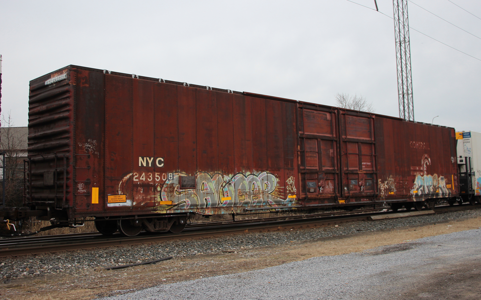NYC 243508 is seen in the consist of CSX M422-09 at Elsmere, DE on 2/10/24. Car is ex CR 243508/CR 297685 and was built 4-78 by Greenville Steel Car.