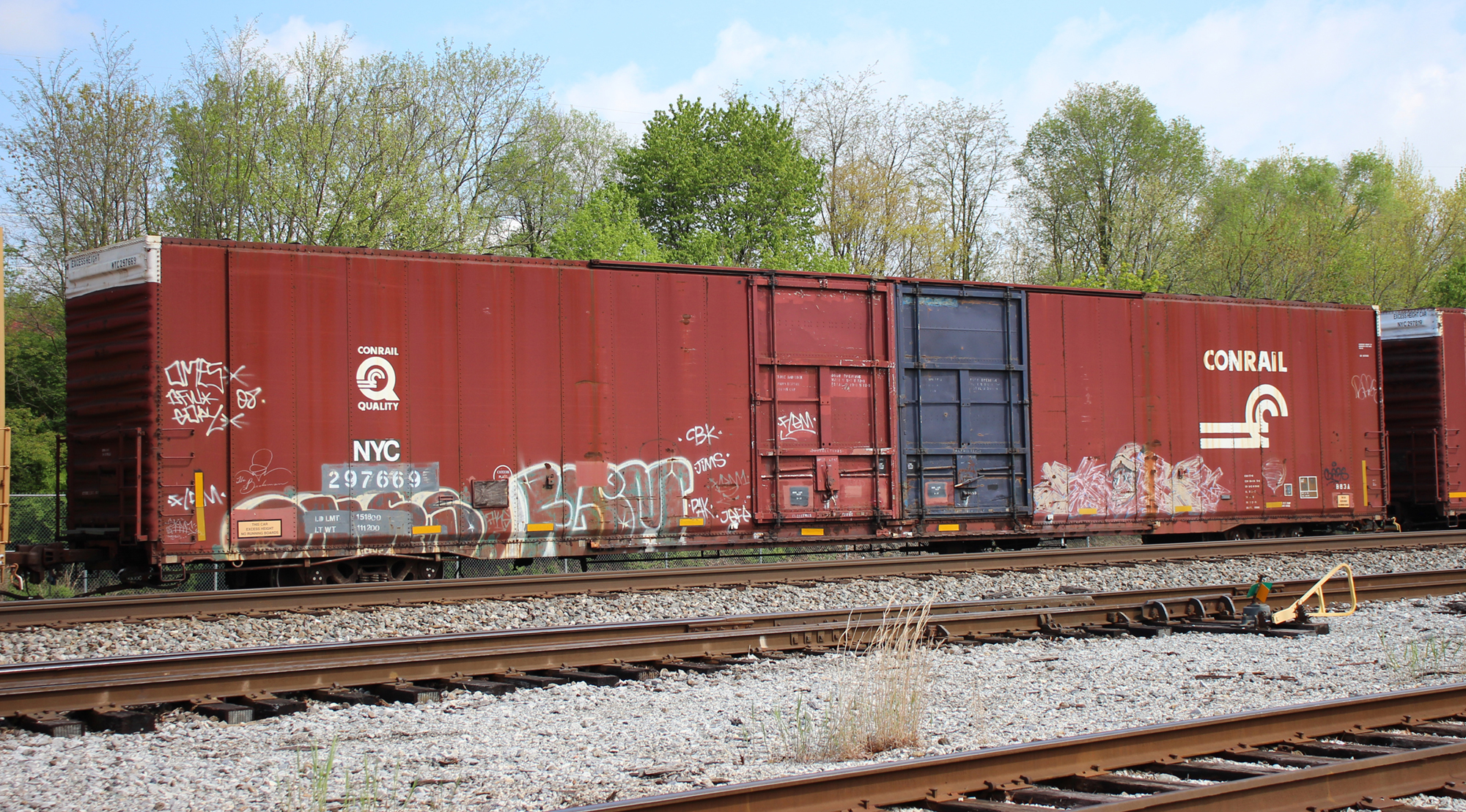NYC 297669 is seen at Elsmere, DE on 4/20/22. Car is ex CR 297669 and was built 4-78 by Greenville Steel.