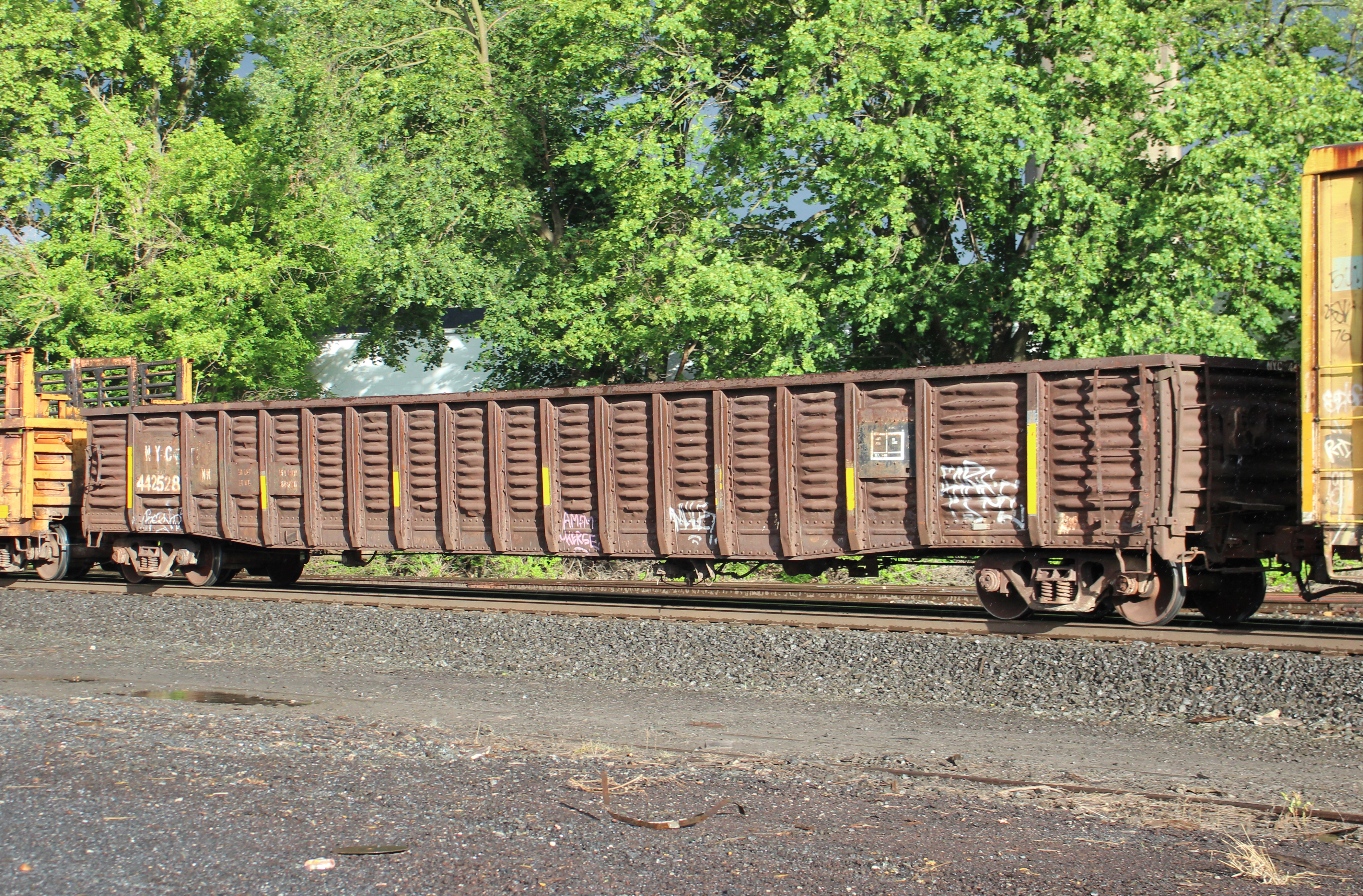 NYC 442528 is seen in the consist of CSX M409-24 on NS rails at Sinking Spring, PA on 5/24/25. Car is ex PRR 442528 and was built 7-66 as a PRR G44 class gon. It is the last car active on CSX from the NYC 442450-442649 series which was built as PRR 442450-442649.