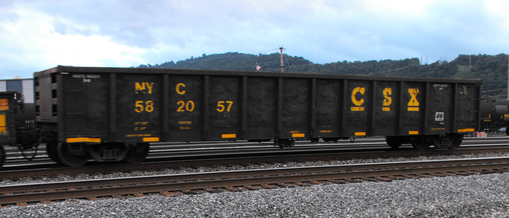 NYC 582057 is seen in CSX Q358-26 at Cumberland MD on 6/27/13. Car is ex CR 582057 and was built 5-80.