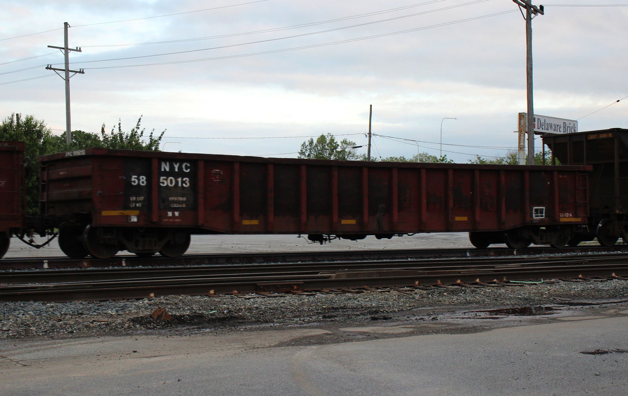 NYC 585013 is seen in the consist of CSX Q410-22 at Elsmere, DE on 5/24/20. Car is ex CR 585013/DTI 9637 and was built 11-71 by Thrall. Photo by Chris Carangi.