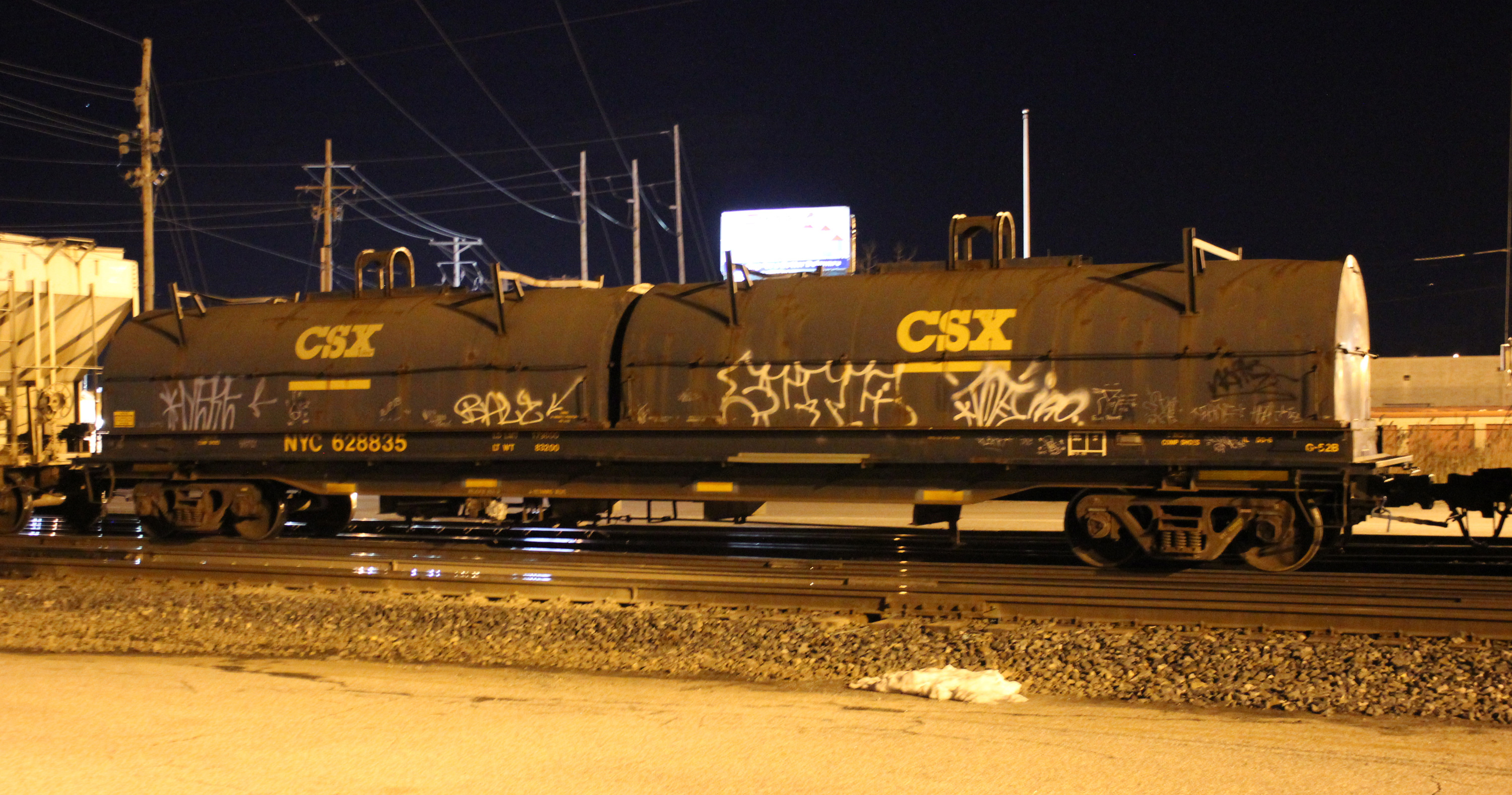 NYC 628835 is seen in the consist of CSX Q301-15 at Elsmere, DE on 3/16/18. Car is ex CR 628835, built 5-80, and was painted RA 5-02.