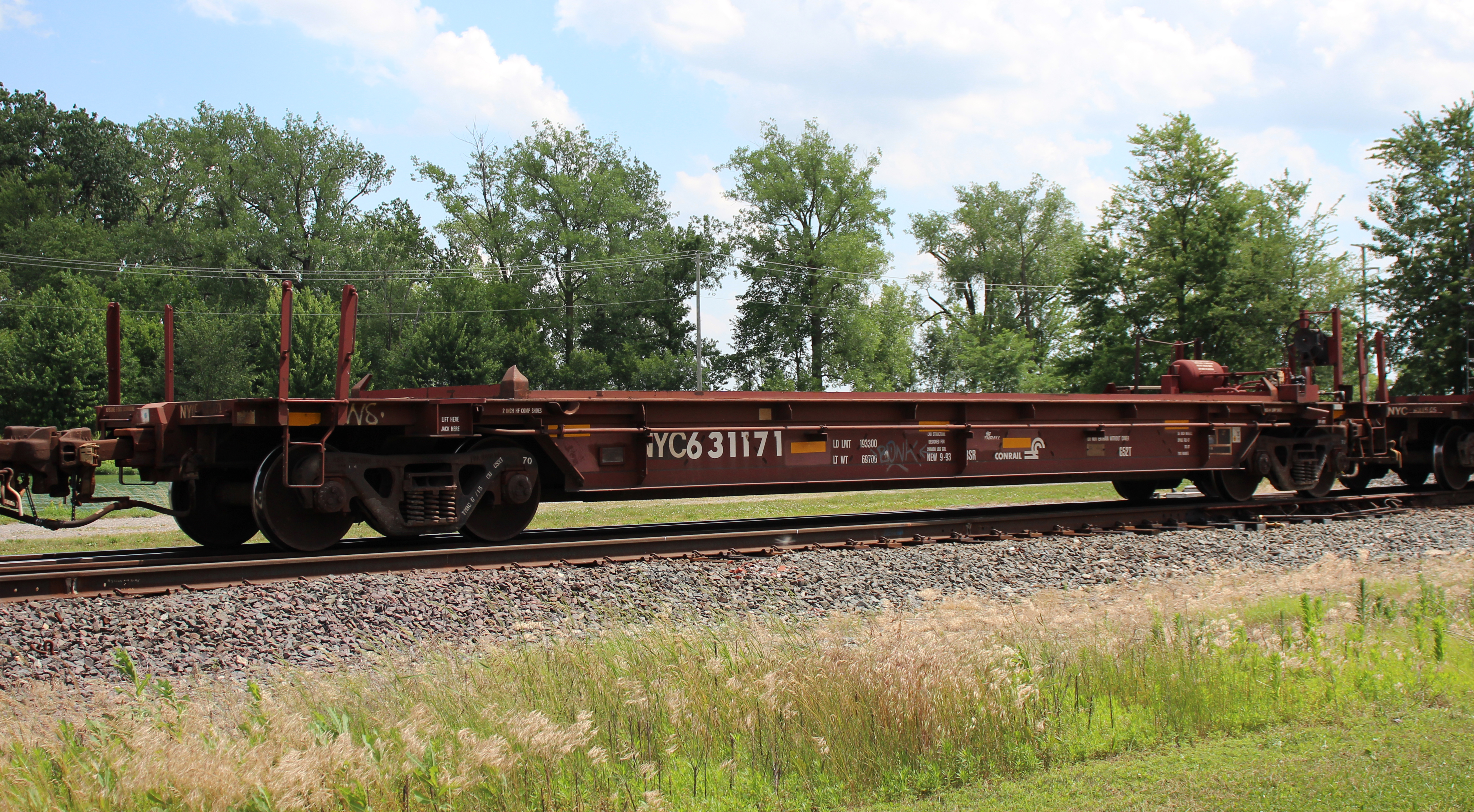 NYC 631171 is seen in the consist of CSX B523-27 at Deshler, OH on 6/27/25. Car is ex CR 631171 and was built 9-93 by Thrall.