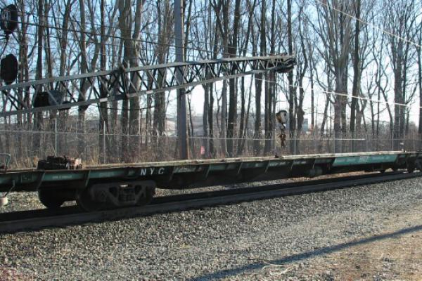 NYC 725525 is seen in the consist of WB CSX W038-28 at Elsmere, DE. Car is ex CR 725525/CR 784041/MDAX unknown and was built 1-62.
