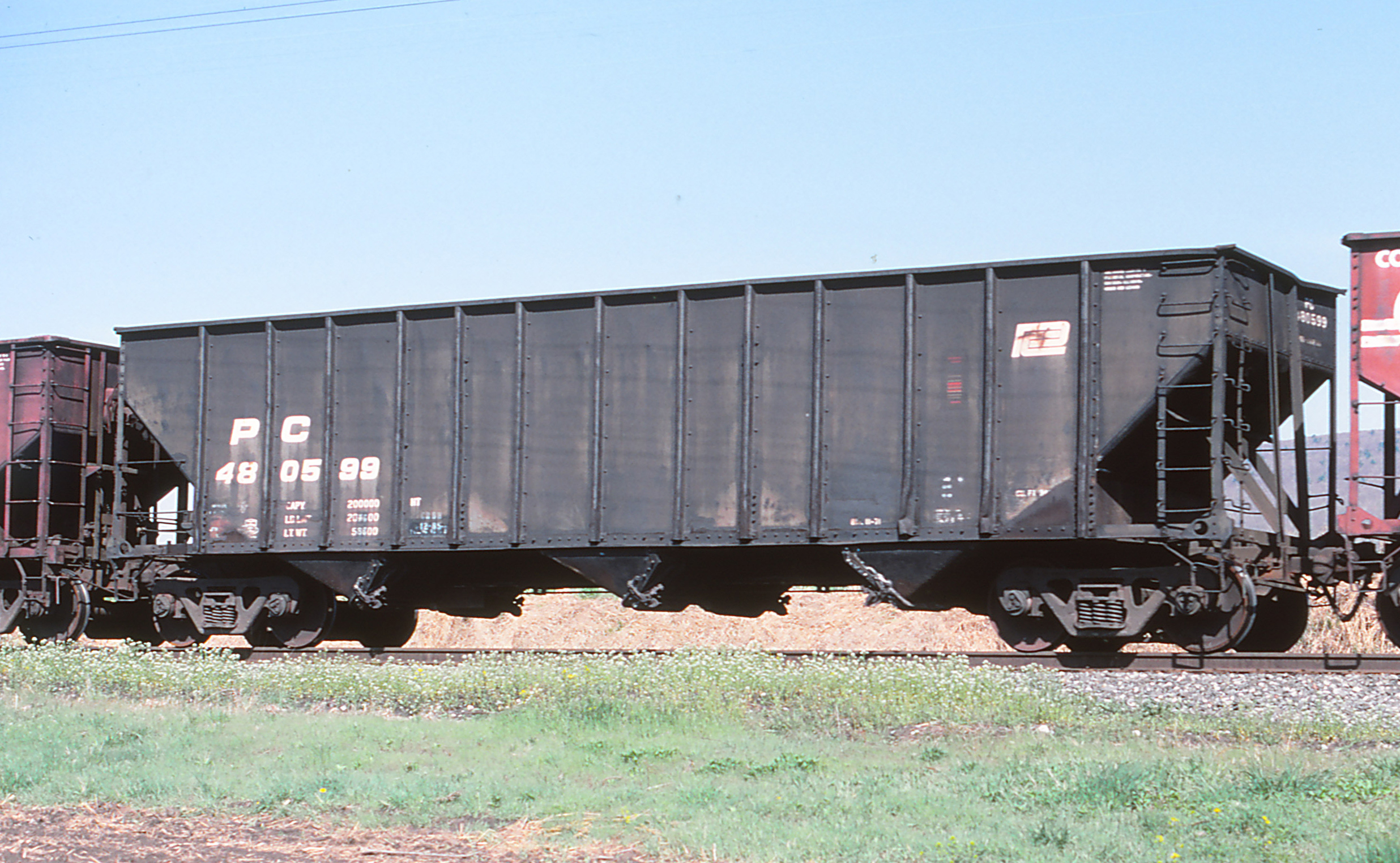 PC 480599 is seen in the consist of XCL at Muncy, PA on 5/1/88. Car was built 11-71 and was deleted 8/4/94.