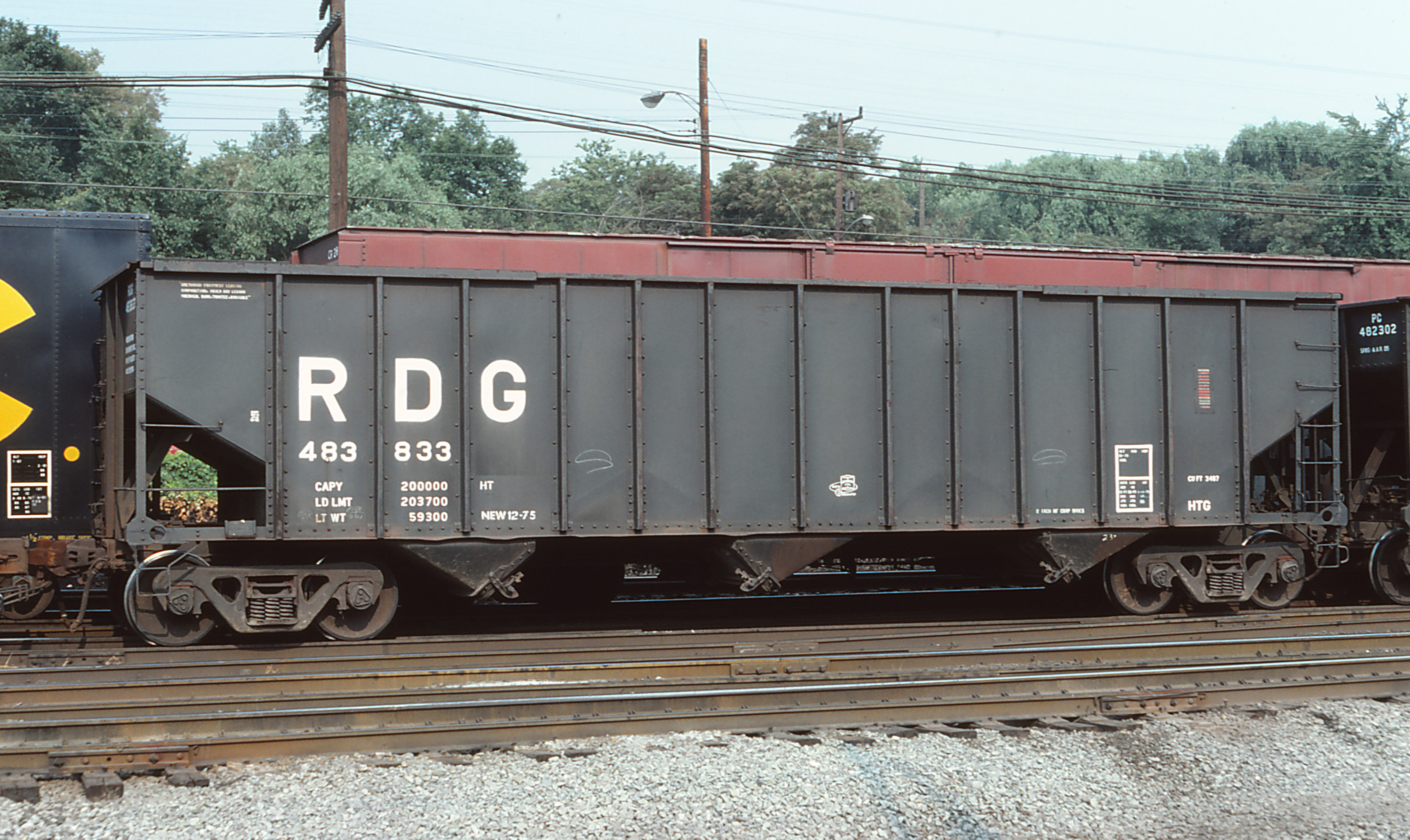RDG 483833 is seen at Conway, PA in Aug of 1981. Car was built 12-75 by Bethlehem Steel. It was deleted 4/25/00 and became RBMN 7204 which was then deleted on 2/27/12.